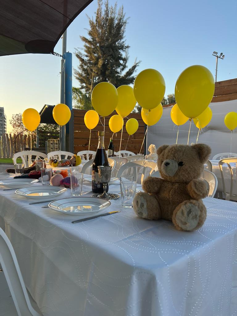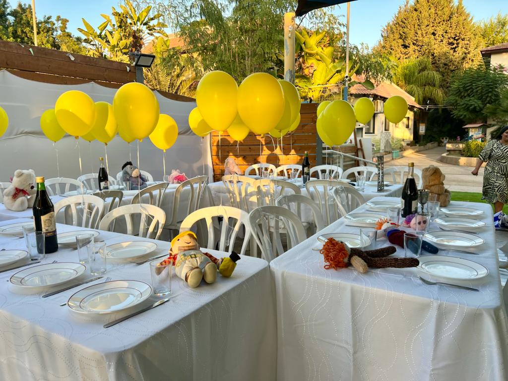 With today’s lines I would like to share with you two special moments that we all experienced in Neve Hanna Children’s Home. The last Shabbat at Neve Hanna was a sad and contemplative Shabbat. The children arranged a large table outside and set it up in the most beautifully manner. But not even one of the 30 guests was present. This table was set for the 30 children who are being held hostage in the Gaza Strip. There was a yellow balloon attached to each chair. It was very emotional for our children, because they can particularly identify with the younger ones among the almost 240 abductees; after all, many of them are their age, but also younger or older, just like their siblings. As always in Neve Hanna, it is considered important to be able to express concerns, open questions, fears and much more, of course not only in the form of this table, but also addressed by the adults. Speeches and of course prayers also the songs the children sang helped to try to cope with this difficult subject.