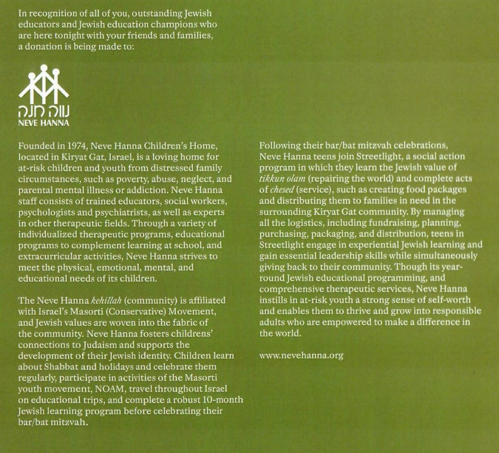 “In recognition of all of you, outstanding Jewish educators and Jewish education champions who are here tonight with your friends and families, a donation is being made to: Neve Hanna Children’s Home.”