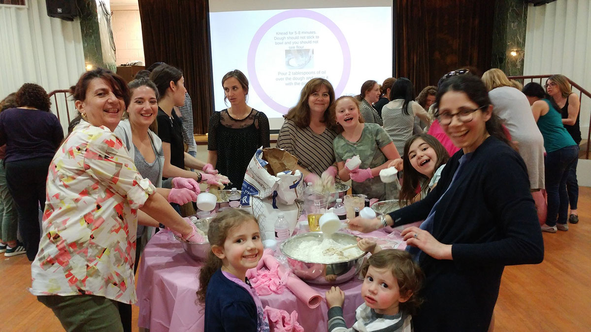 On Sunday, January 21, 2024, the Forest Hills Jewish Center Sisterhood and the FHJC School Board gathered together for an afternoon of Baking Challah with Amy Bochner Newman. It was a multi-generational event with 60 attendees (more, including babies!)